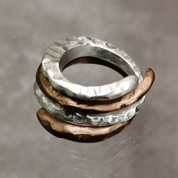 ANELLO IN ARGENTO 925 MARTELLATO E ANELLO IN BRONZO MARTELLATO CHE SI UNISCONO IN UNO SOLO