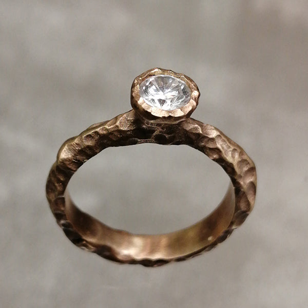 Anello artigianale Croods in bronzo rosso martellato e satinato con zircone unisex